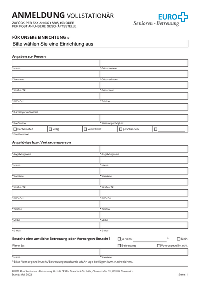 Sie interessieren sich für einen Pflegeplatz in bei uns? Gerne können Sie unverbindlich unser Anmeldeformular ausfüllen, ausdrucken und uns per Fax oder per Post zugehen lassen. Wir behandeln die Daten selbstverständlich vertraulich und werden uns bei Ihnen melden.